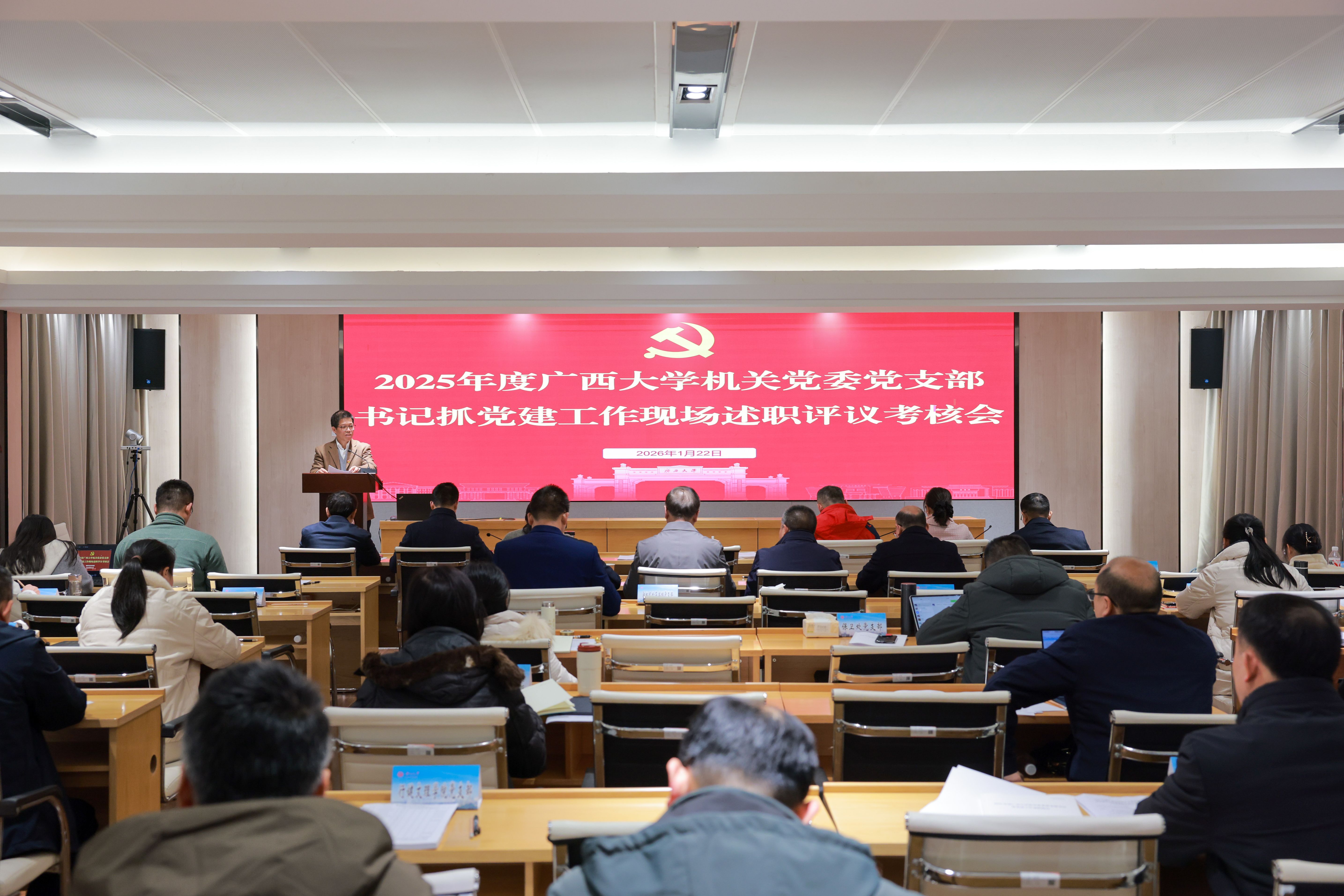 1月22日下午,机关党委召开2025年度党支部书记抓党建工作现场述职评议考核会议。23位党支部书记现场述职。校党委副书记宁旭初到会指导并作总结讲话。机关党委书记郭昌明主持会议。