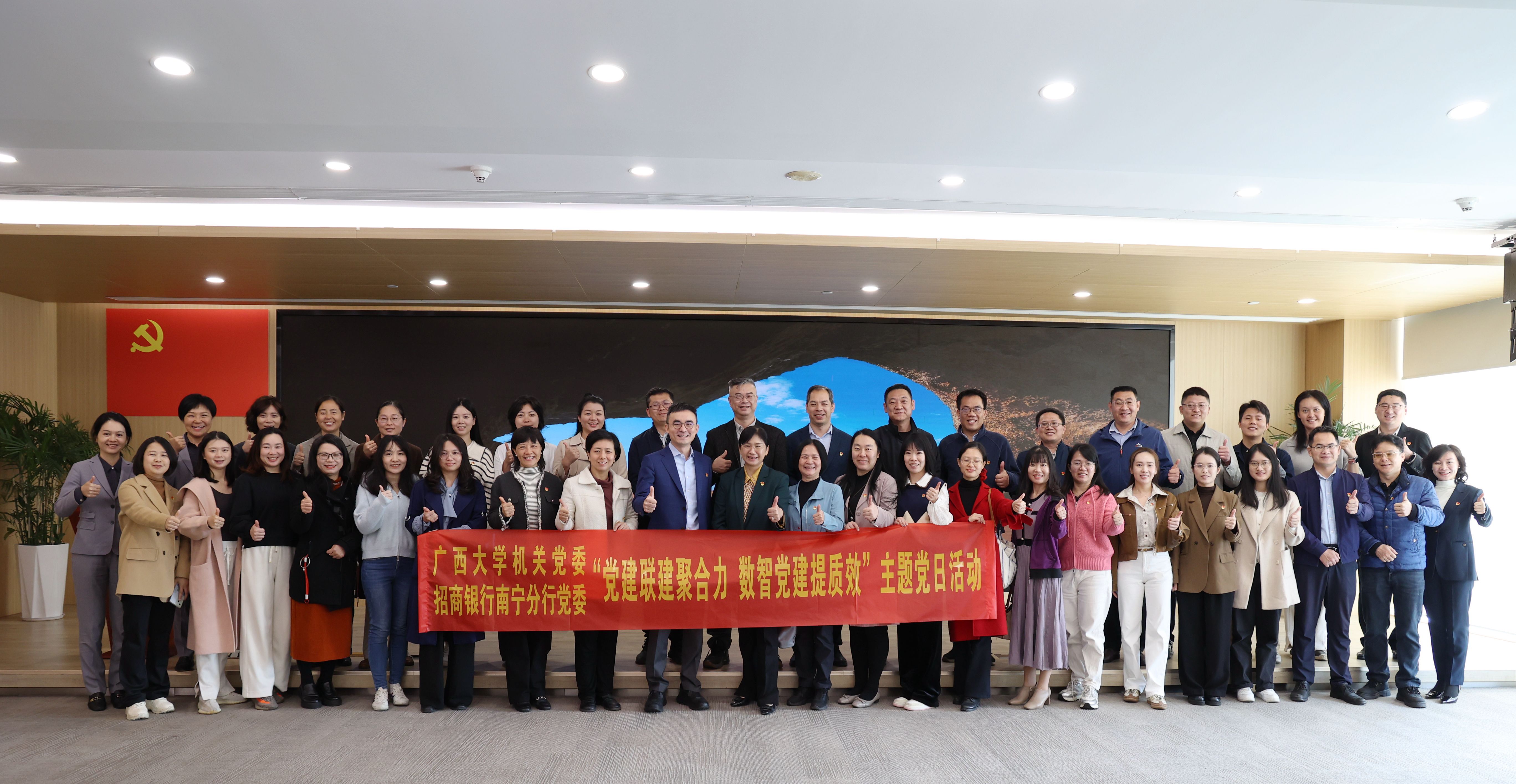 为深入学习贯彻新时代党的建设总要求,扎实推进基层党组织规范化、标准化、信息化建设,3月5日上午,机关党委与招商银行南宁分行党委以“党建联建聚合力 数智党建提质效”为主题联合开展主题党日活动。机关党委 23 个党支部均派党员代表参加,校资产公司受邀参与活动,共 60 余名党员同步参加本次活动。
